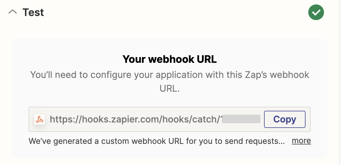 In the Test section, copy the url. We need this webhook url to configure InfinyOn Cloud as a data source for this Zap.